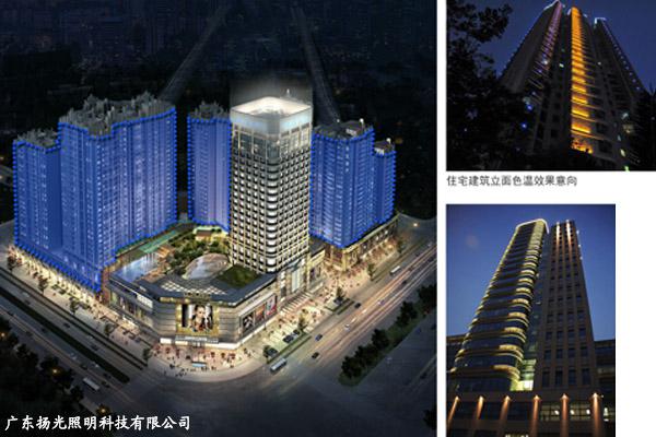 商業(yè)綜合樓立面面對著人流量較多,是燈光靚現(xiàn)的重要區(qū)域。色溫可選用暖黃或彩色光體體現(xiàn)現(xiàn)代時尚感。