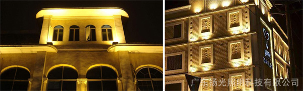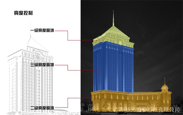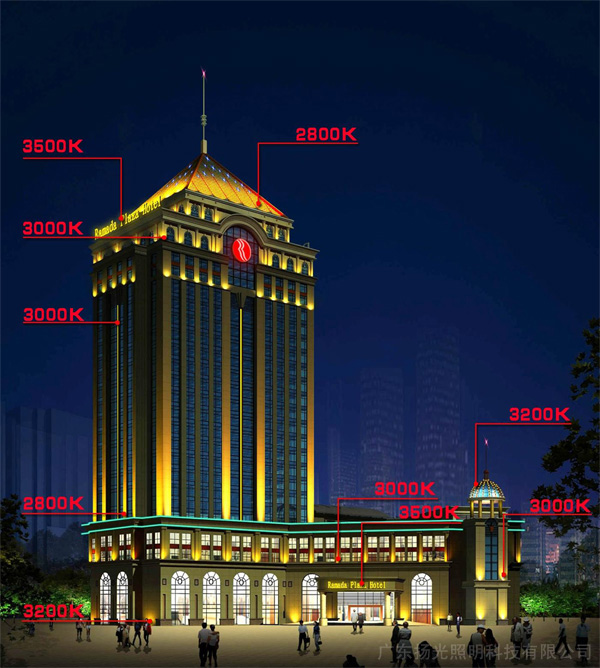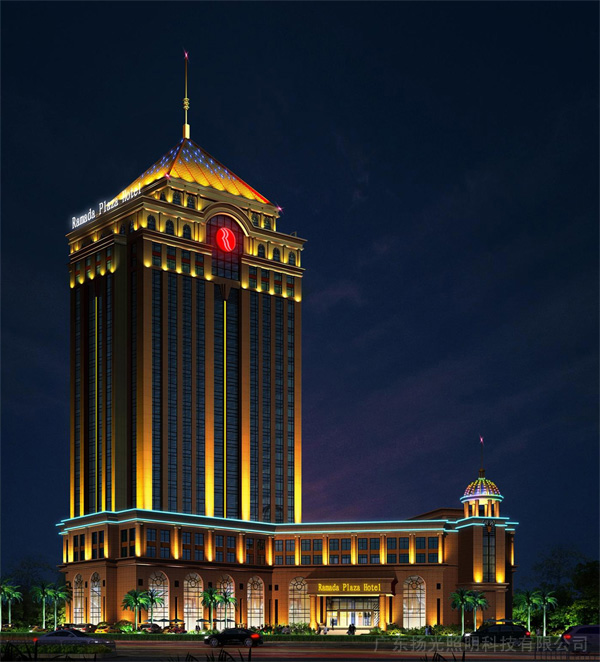 建筑整體以暖色調(diào)為主,頂部多用投光照明體現(xiàn)建筑結(jié)構(gòu)與光感;立面采用埋地?zé)襞c投光燈相結(jié)合的方式營造酒店雅致而不失華麗的燈光魅力,褐樓頂部利用藍(lán)色線管勾勒輪廓,使整個人口燈光注入新穎、活潑的情調(diào)。