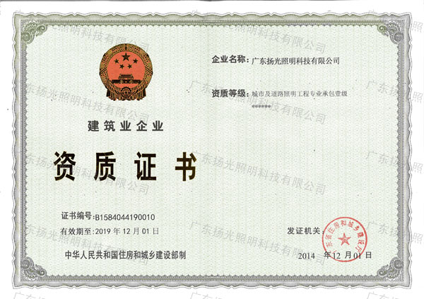 12月初,在廣東城鄉(xiāng)及住房建設(shè)廳領(lǐng)導的大力堅持下,經(jīng)國家住房和城鄉(xiāng)建設(shè)部審查核準,揚光照明取得“城市及道路照明工程專業(yè)承包壹級資質(zhì)”。