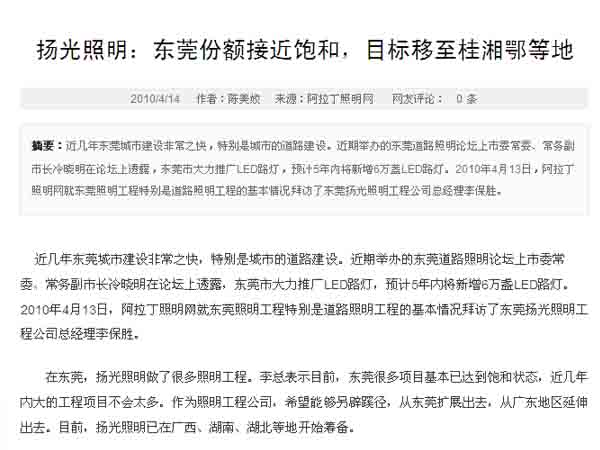 在東莞,揚(yáng)光照明做了很多照明工程。李總表示目前,東莞很多項(xiàng)目基本已達(dá)到飽和狀態(tài),近幾年內(nèi)大的工程項(xiàng)目不會太多。作為照明工程公司,希望能夠另辟蹊徑,從東莞擴(kuò)展出去,從廣東地區(qū)延伸出去。目前,揚(yáng)光照明已在廣西、湖南、湖北等地開始籌備。